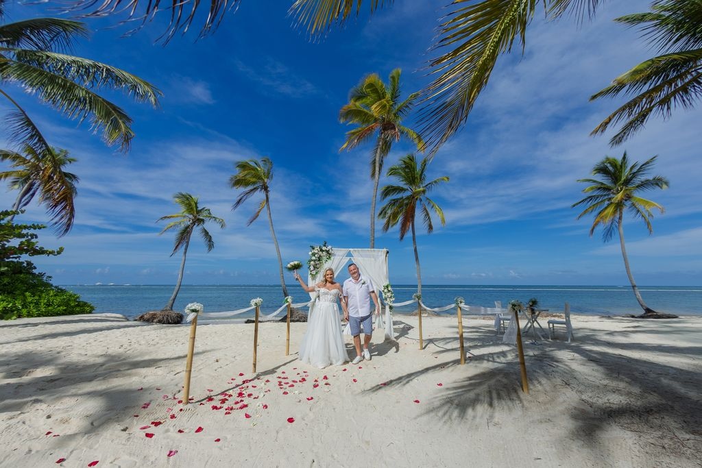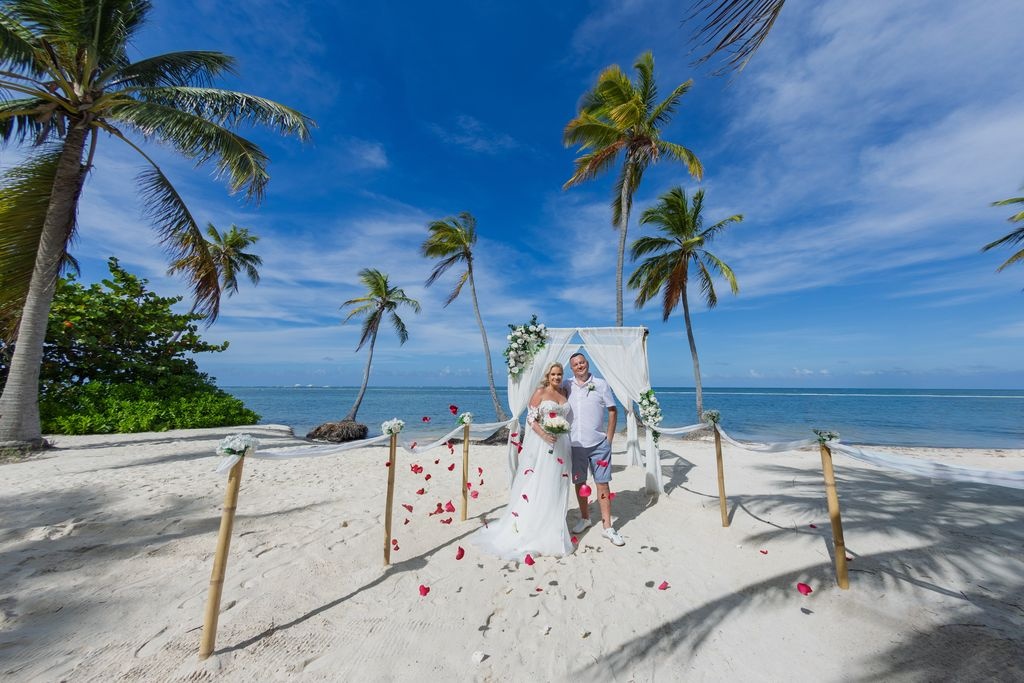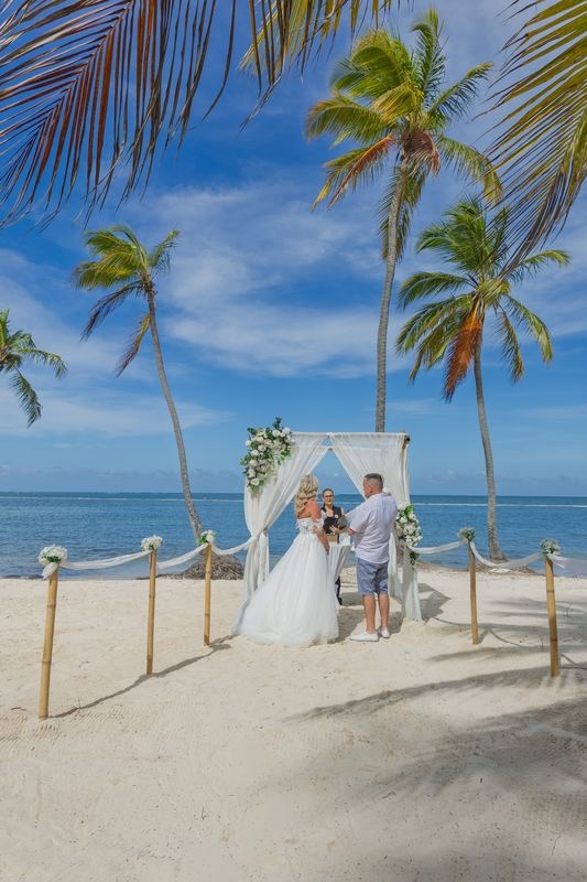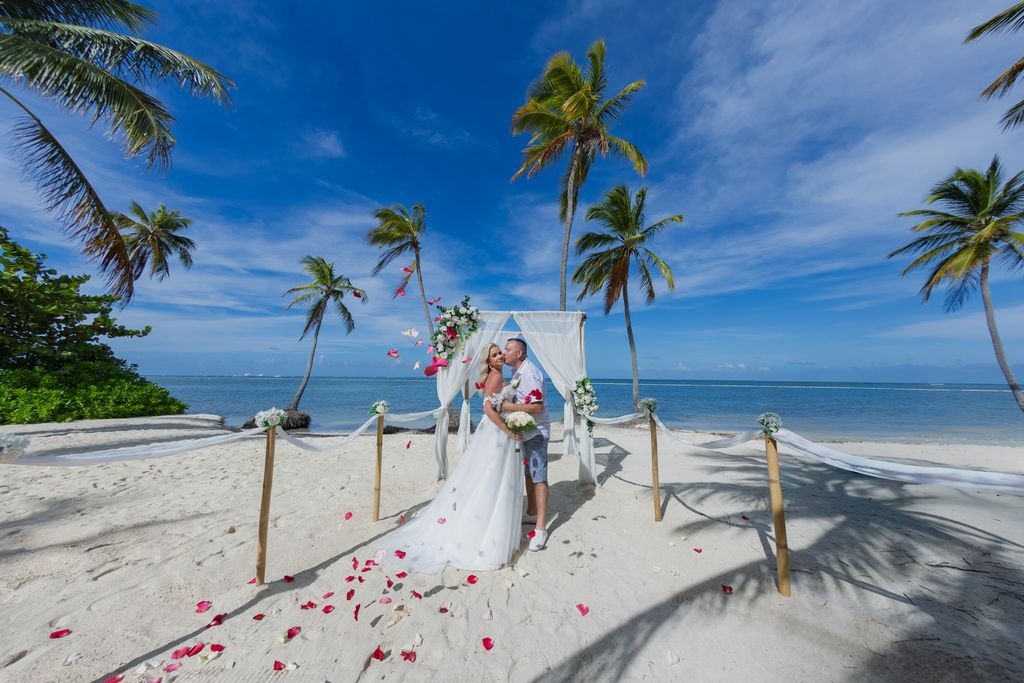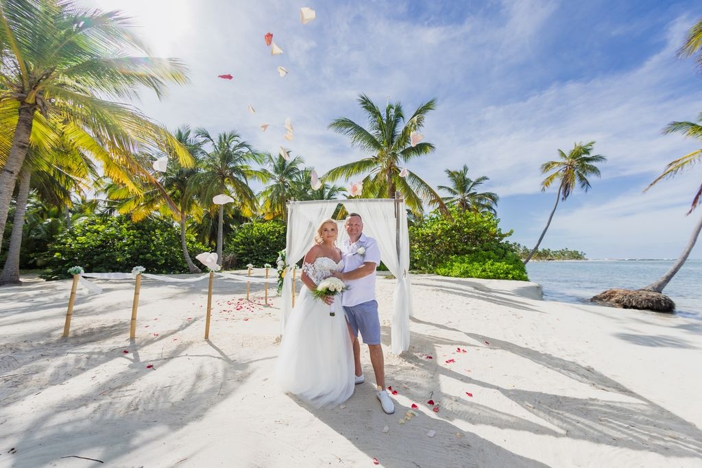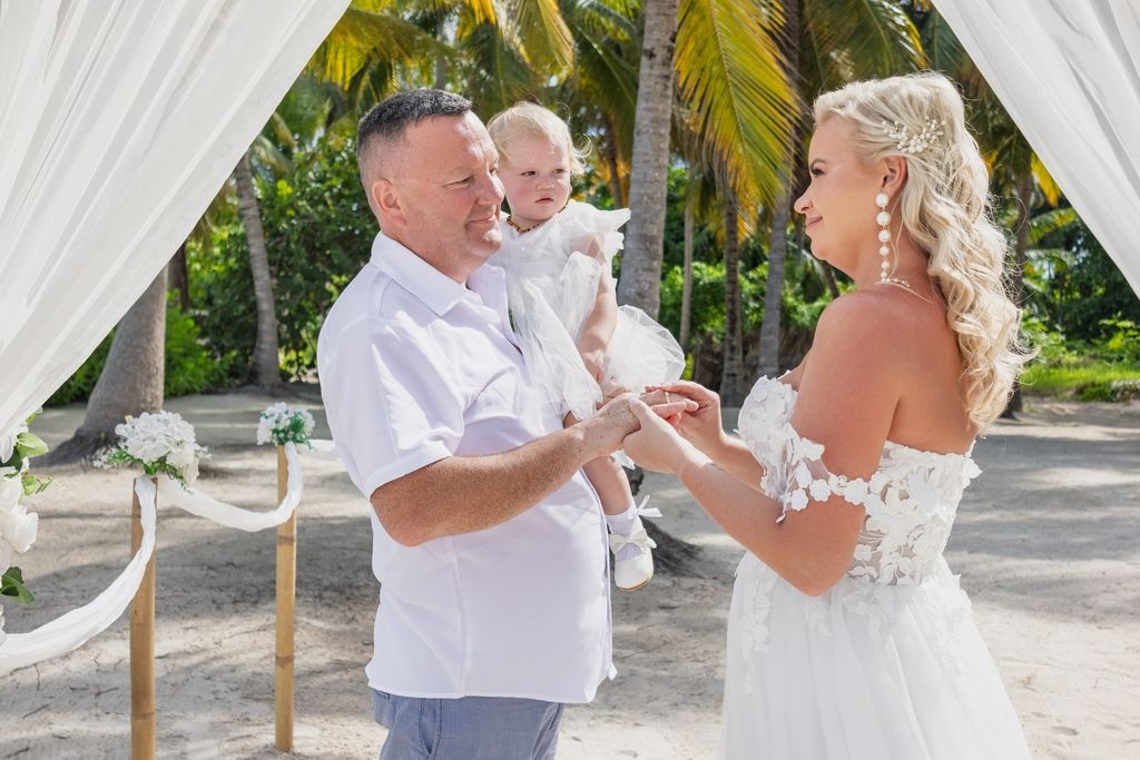 Beach wedding Punta Cana: the couple celebrated on the shore with their 1.5-year-old daughter, a bamboo arch, white linens and white flowers. The turquoise sea, soft white sand and lush palms created a calm, joyful setting.