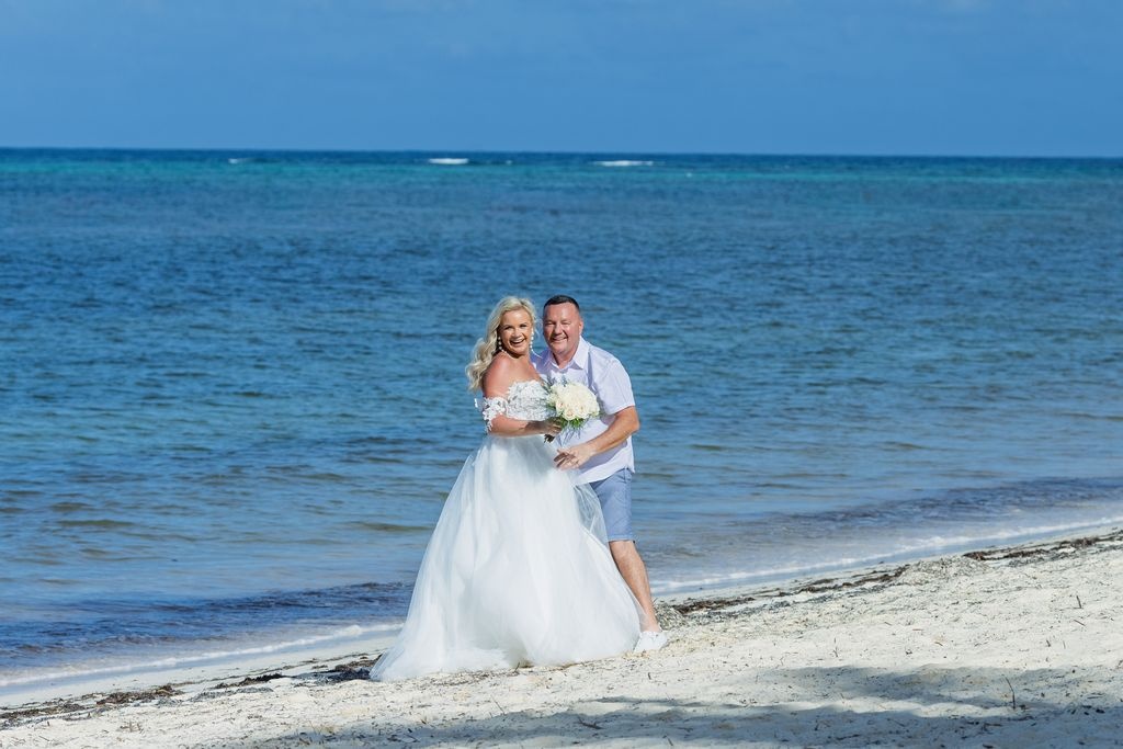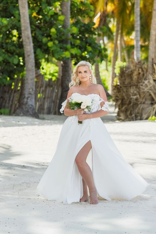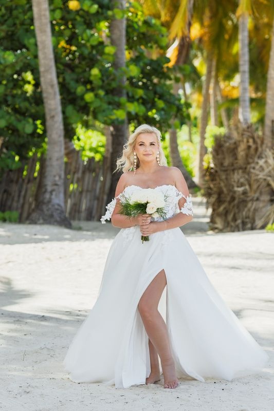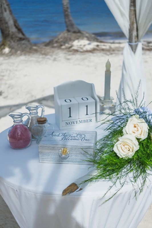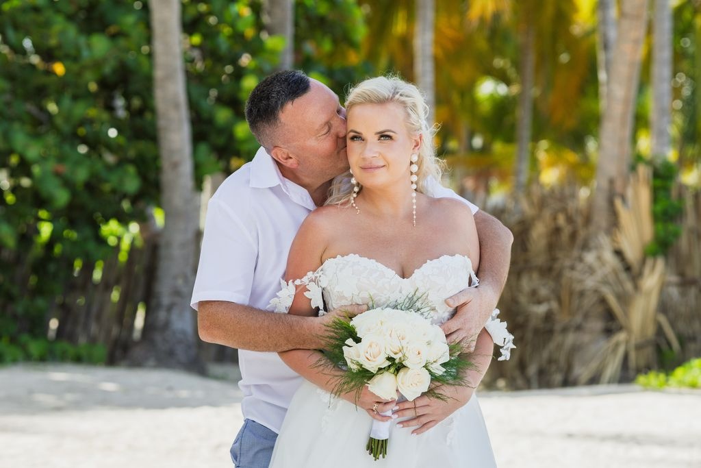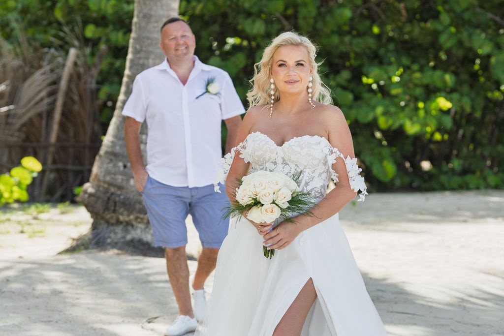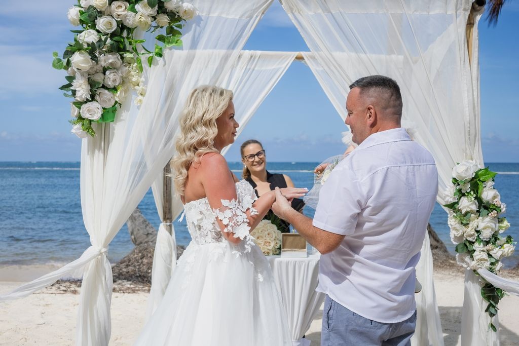 Beach wedding Punta Cana: the couple celebrated on the shore with their 1.5-year-old daughter, a bamboo arch, white linens and white flowers. The turquoise sea, soft white sand and lush palms created a calm, joyful setting.