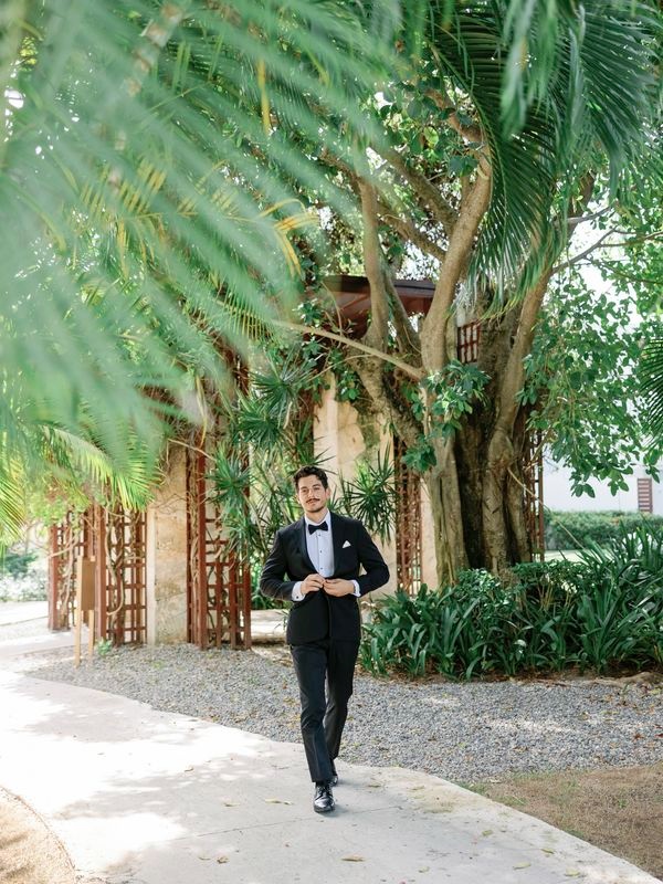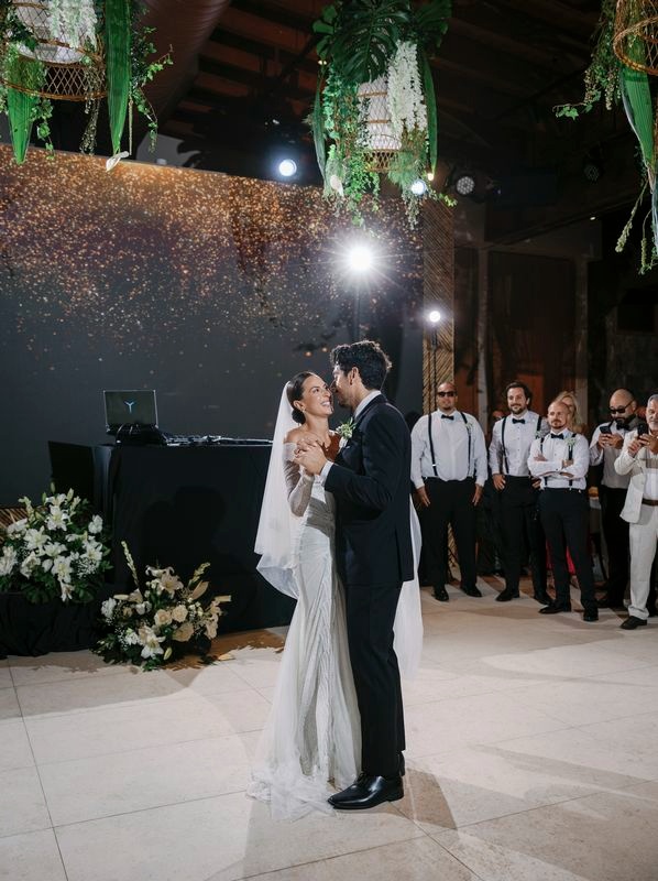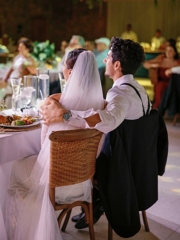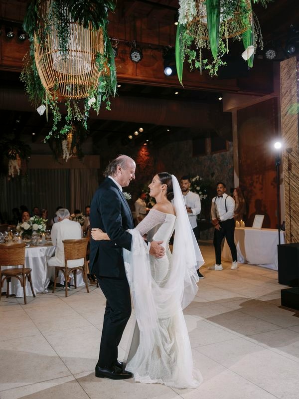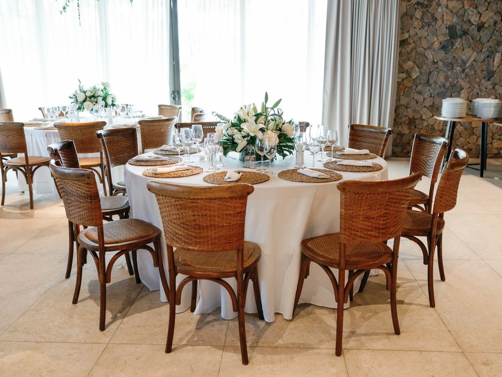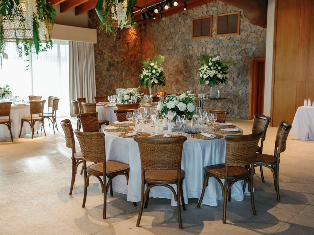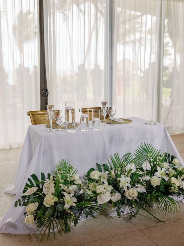 After the vows, everyone moved to the charming Chez Bisutti restaurant for the reception. The transition from sand to dining felt seamless, and the décor immediately captured hearts. Tables featured lush green arrangements mixed with crisp white flowers, creating a chic tropical palette that felt both fresh and refined. In addition, carefully chosen lighting and thoughtful details made the venue warm and intimate.