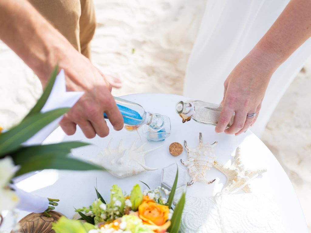 Under a round arch beautifully decorated with white flowers and palm leaves, the groom awaited his bride. Their emotional first look, heartfelt vows, and symbolic sand ceremony in a glass bottle made the day unforgettable. The celebration continued with champagne, rose petals, and endless smiles.