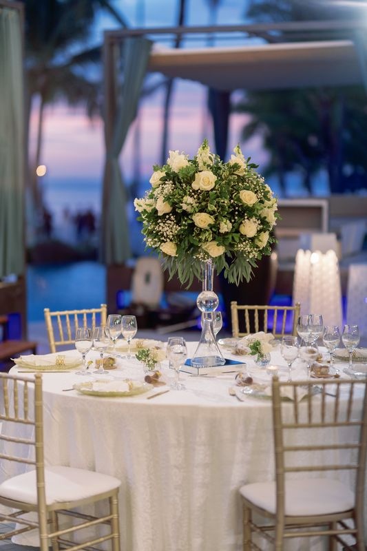 Since not all the guests were staying at a resort, the couple chose a wedding venue outside the resort to make it easier for everyone to attend. The beachfront ceremony, filled with meaningful blessings, created a magical backdrop by the ocean. Guests then enjoyed a relaxing cocktail hour in the lounge area before moving to the reception.