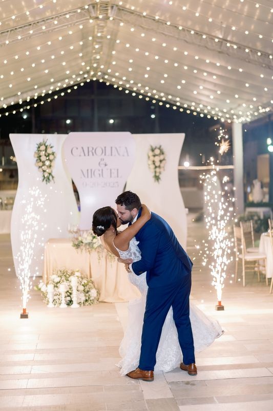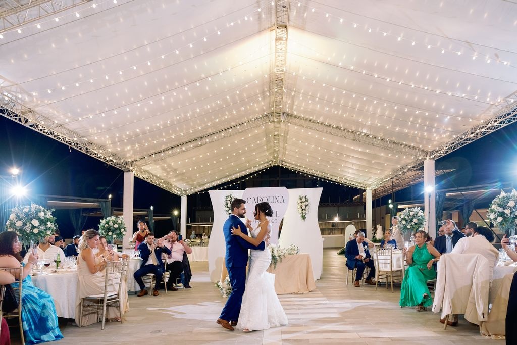 To ensure the celebration was comfortable and protected from the tropical weather, we designed a wedding reception under a tent with romantic string lights, creating the perfect ambiance.