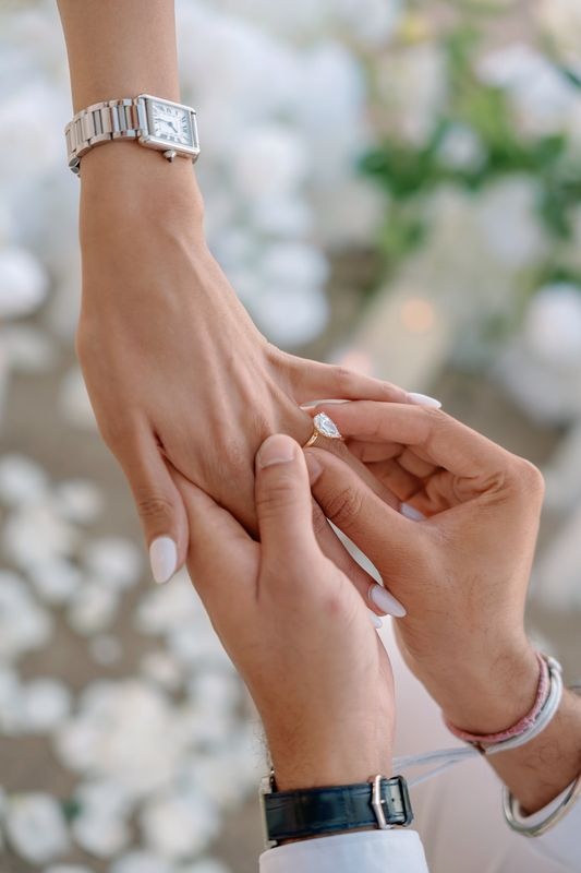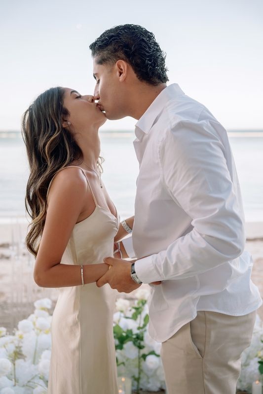 Mehtaab gently placed the engagement ring on her finger. Immediately afterward, the couple embraced and shared a romantic kiss while fireworks continued to sparkle above the beach.