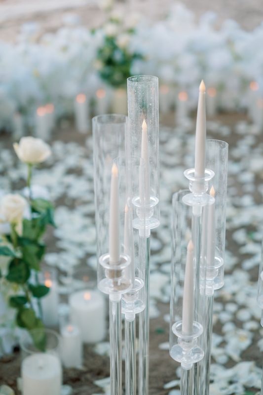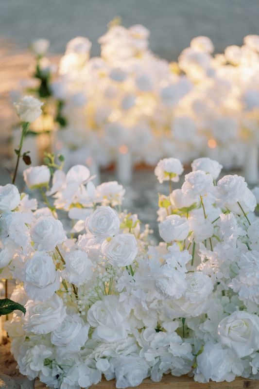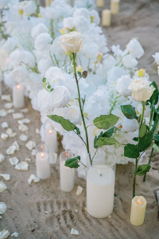 Around the area, elegant arrangements of white flowers blended beautifully with lush tropical greenery. In addition, candles and lanterns surrounded the space. As a result, the warm glowing light created an intimate and magical atmosphere.
