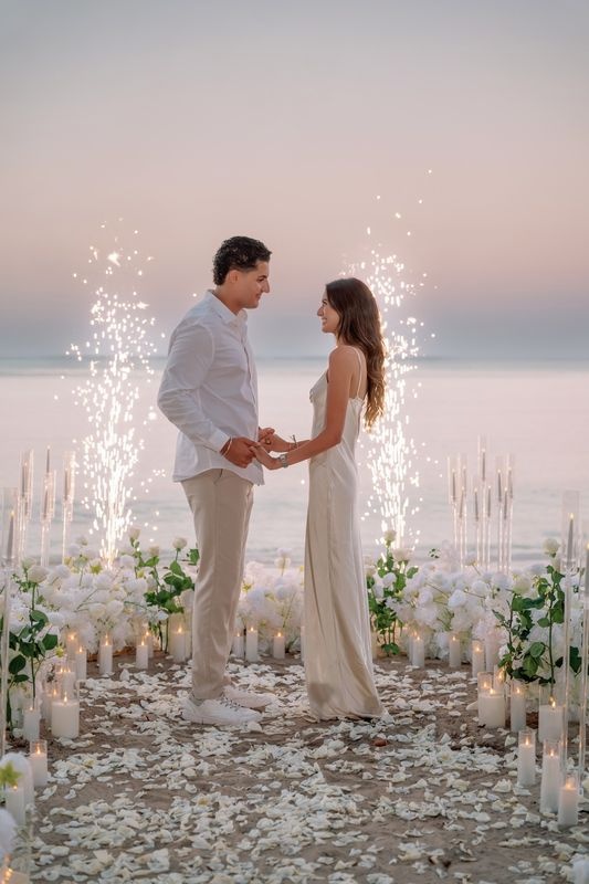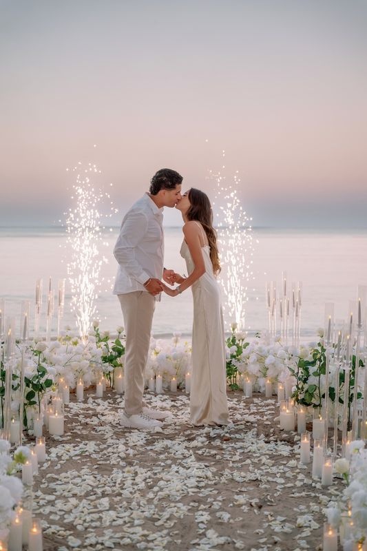 At that exact moment, bright fireworks lit up the tropical evening sky. The sparkling lights reflected across the ocean and the white sand, making the proposal even more unforgettable.