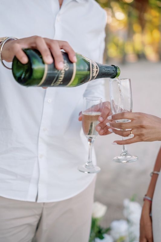 After the proposal, the celebration began. A bottle of champagne waited nearby for the couple.