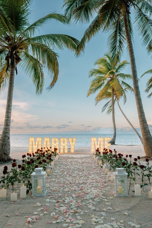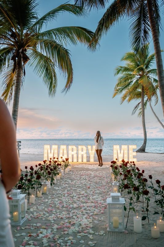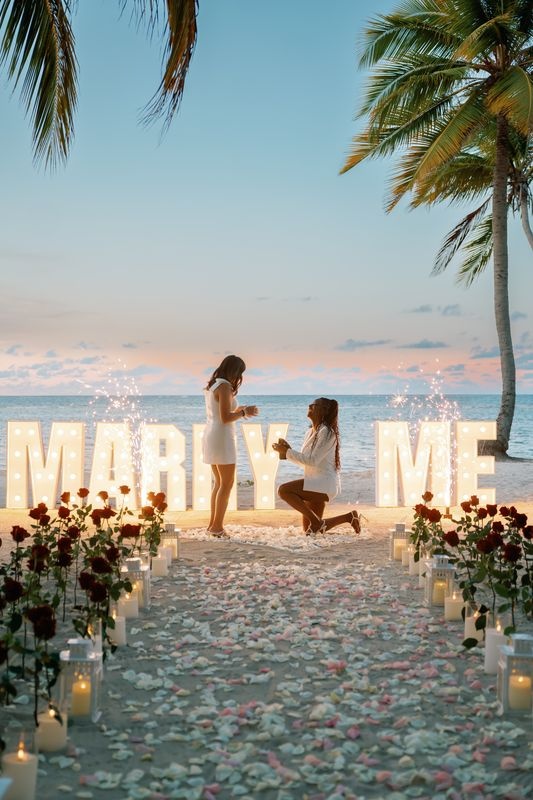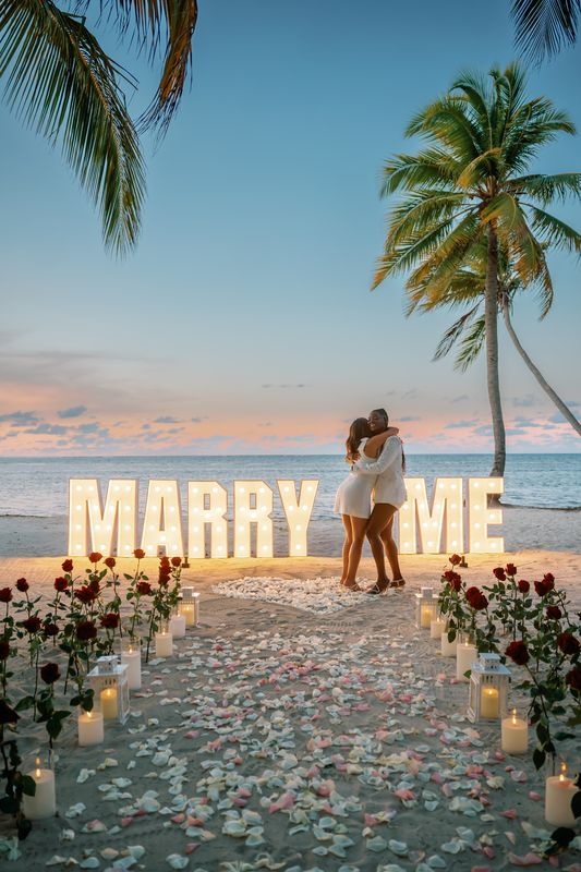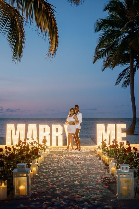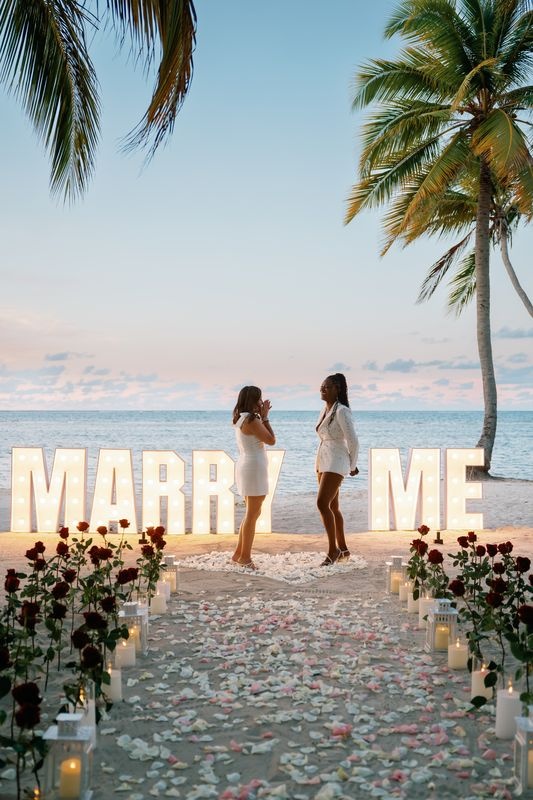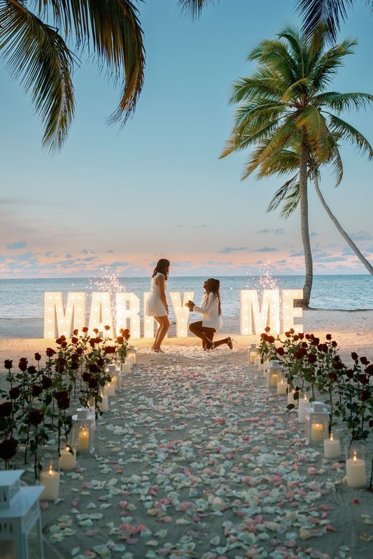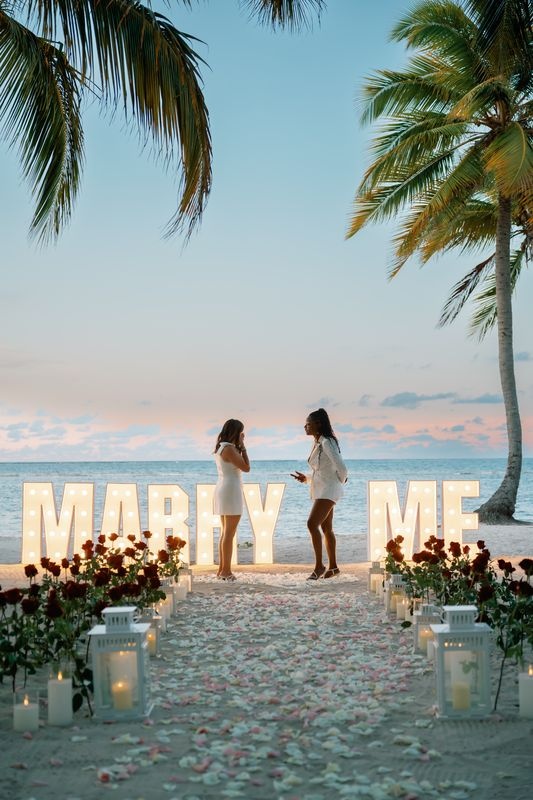 Planning a same-sex marriage proposal in Punta Cana is a beautiful way to celebrate love. On a private Caribbean beach at sunset, one girl surprised her partner with a magical setup. The soft sand was decorated with roses, and a romantic path of petals led to a glowing “MARRY ME” sign. A large heart made of rose petals completed the breathtaking scene.