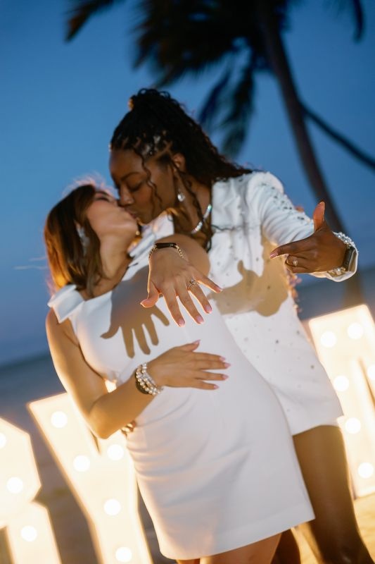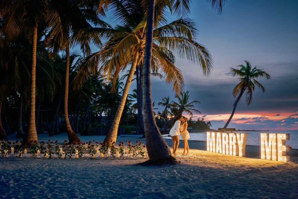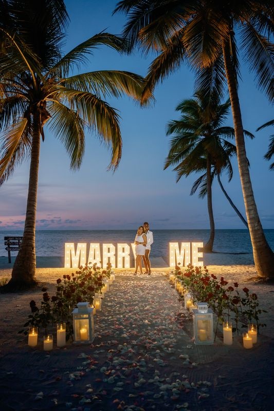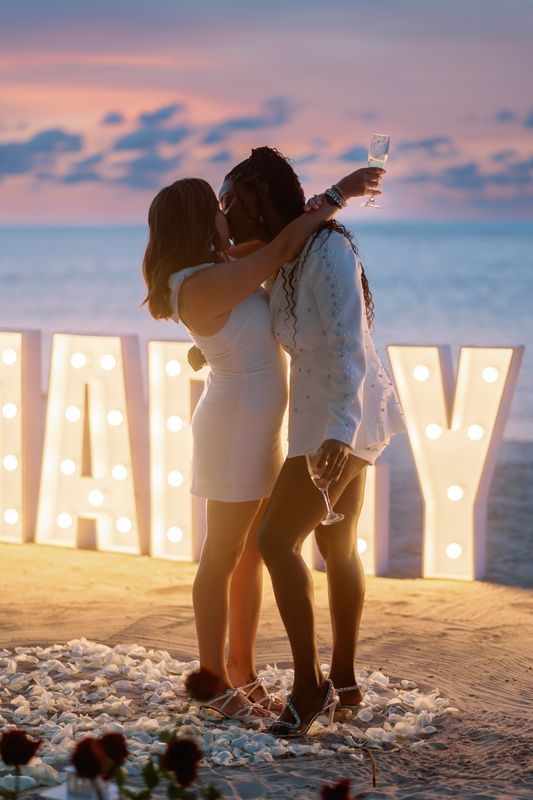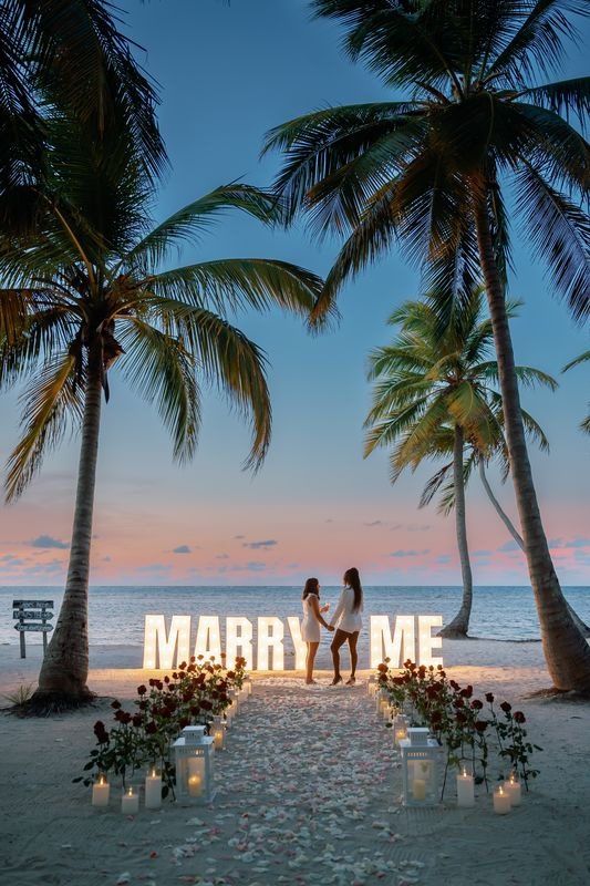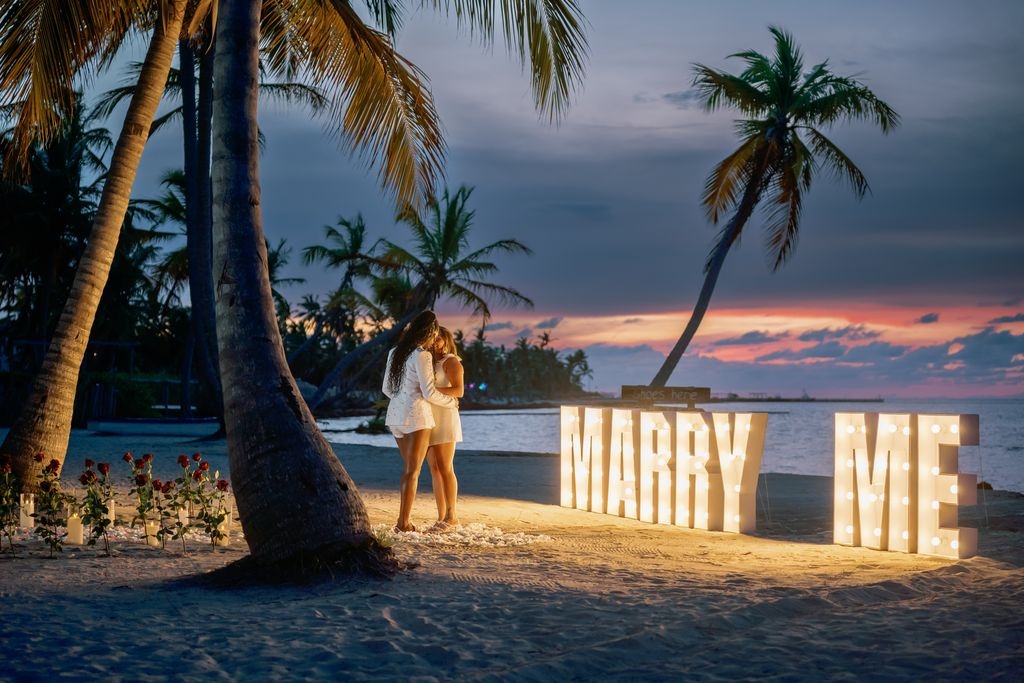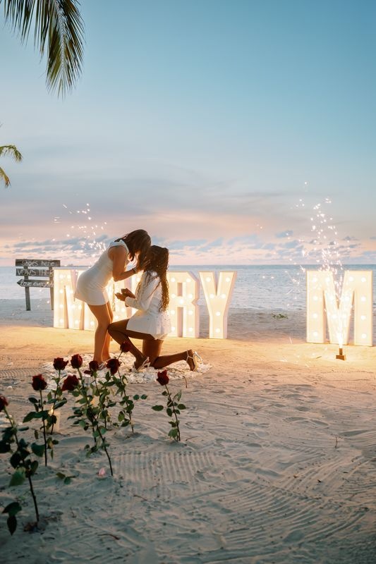 Planning a same-sex marriage proposal in Punta Cana is a beautiful way to celebrate love. On a private Caribbean beach at sunset, one girl surprised her partner with a magical setup. The soft sand was decorated with roses, and a romantic path of petals led to a glowing “MARRY ME” sign. A large heart made of rose petals completed the breathtaking scene.